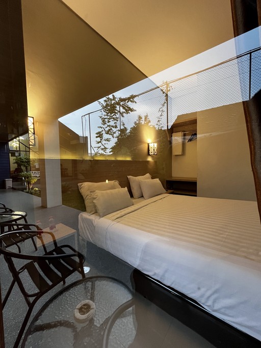 Nikmati kenyamanan dan ketenangan di ruang berdesain alami. Setiap kamar dikelilingi taman hijau dan udara segar yang menenangkan.